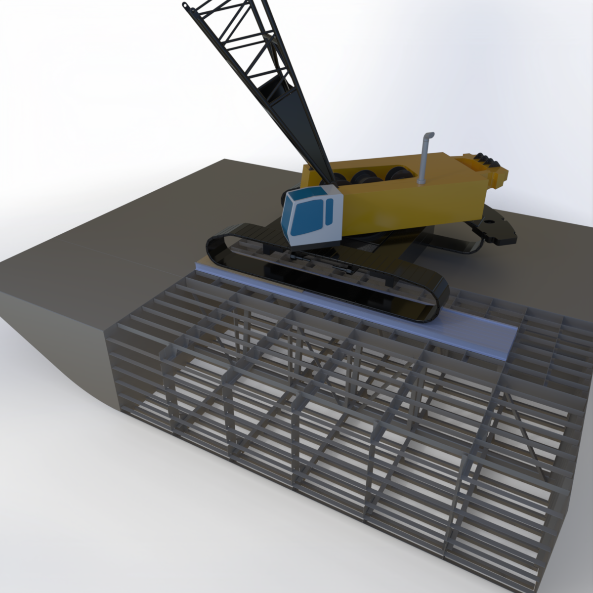 Converting a deck barge designed for bulk cargo into a work platform for construction introduces unique structural challenges. These floating platforms must accommodate various heavy machinery, including pumps, mooring winches, piles, and crawler cranes. Often these heavy machines have been designed for operating on firm level soil which would provide uniform support and benefit from large contact areas. With the trend for increasing lifting requirements on worksites these machines become large enough to exert forces on the barge deck that are far higher than the barges advertised deck capacity and warrant a detailed evaluation.