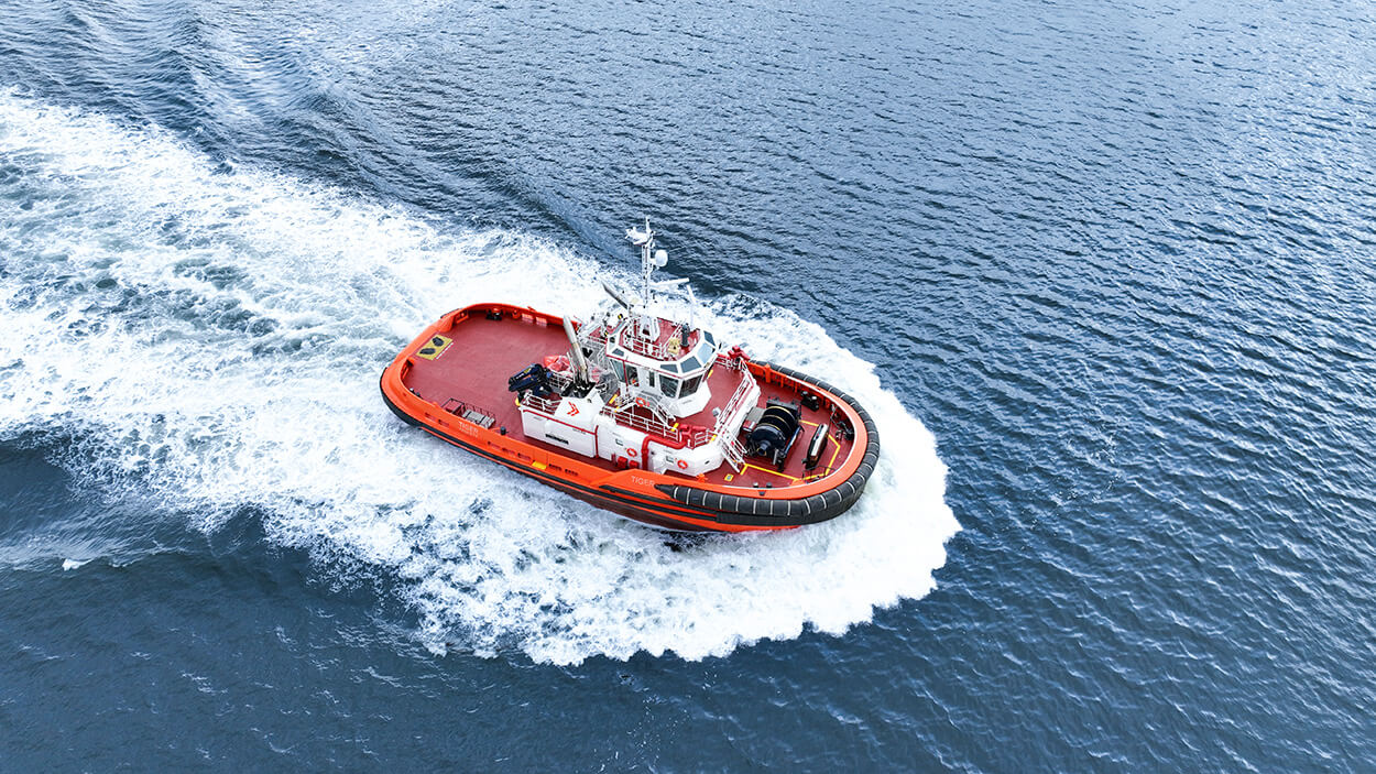 With a fuel capacity of 199m³ and a freshwater capacity of 40m³, the vessel carries Escort Tug, Recovered Oil Second Line (FP>60°C), and Firefighting 1 notations. It is powered by two Caterpillar 3516E main engines, rated at 2,350 bkW at 1,800 rpm, featuring IMO III-certified after-treatment systems. The propulsion system consists of two Kongsberg US255 Z-drives with 2.8m FP propellers.